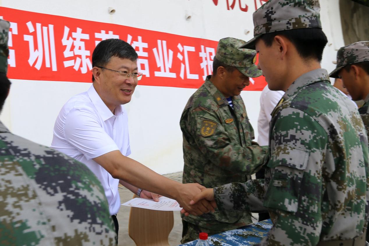 表演结束后,与会领导为学生教官代表颁发学生军事技能训练承训资质证书,并合影留念。