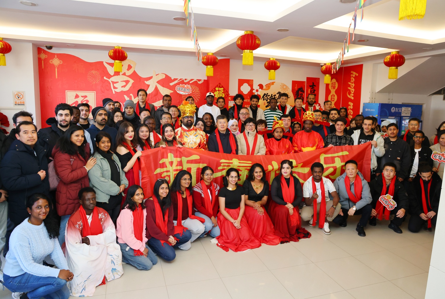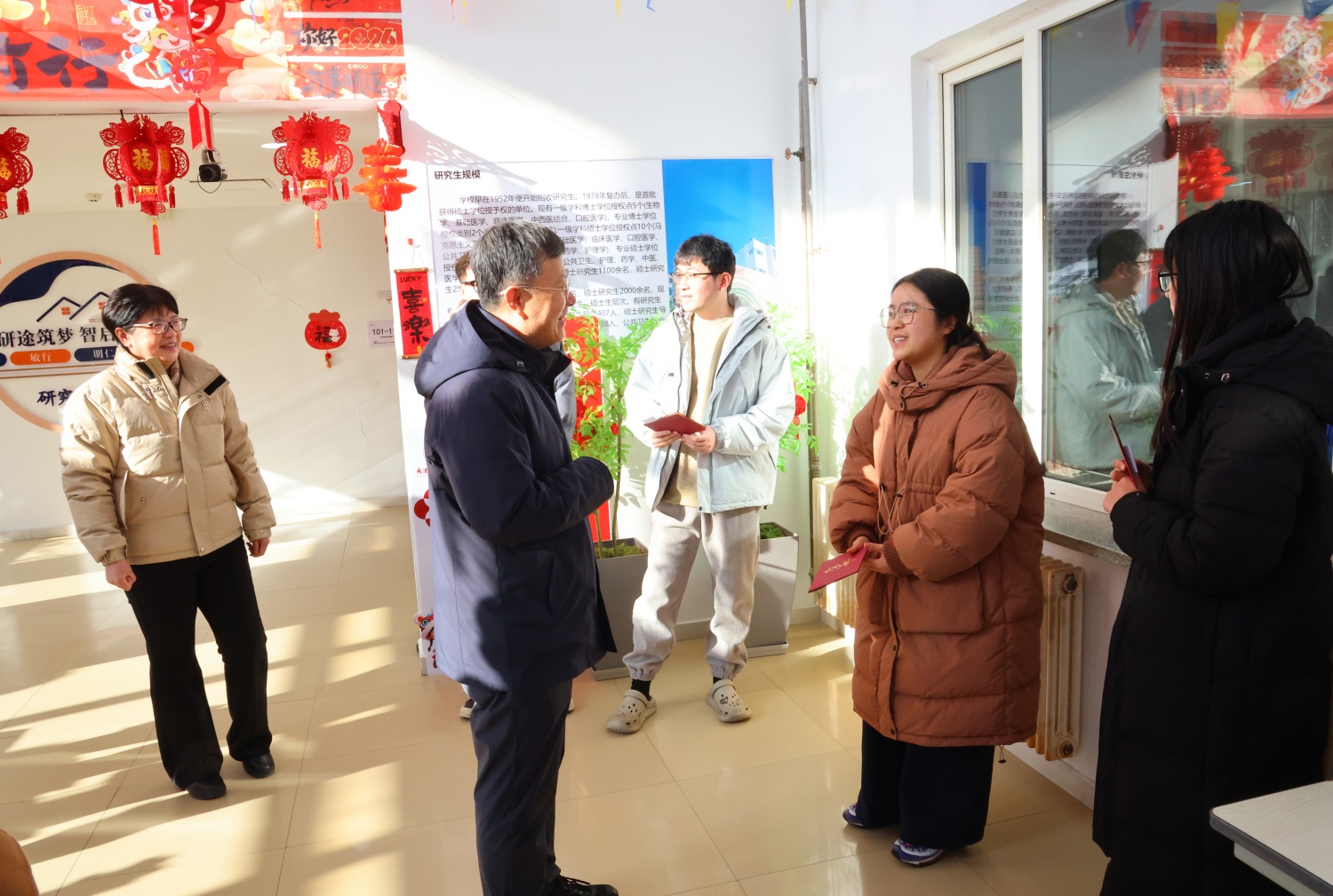 瑞马纳福,年味渐浓。校园学生公寓处处洋溢着喜庆祥和的节日氛围。研究生院为留校学生准备了新春大礼包,传递学校关怀;国际教育学院准备了精彩的文艺节目,并组织留校学生沉浸式体验剪纸、写福字、投壶等中华优秀传统文化技艺,感受独具魅力的中国年俗。学校领导一行与留校的同学们亲切交谈,为他们送上新春的祝福。李海洋表示,学校将全力做好各项服务保障工作,让每一位留校学子都能度过一个安全、温暖的春节。他叮嘱同学们合理安排学习与生活,注意身体健康和出行安全,在感受中国年味、传承中华文化的过程中收获成长。